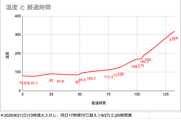 - 9月炭窯温度変化(2025年[9/21]火入れ>2日後温度上昇>6日後閉窯)